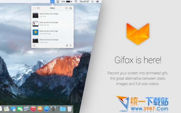完成后 Gifox 会在顶部菜单栏出现一个 icon,点击出现的窗口就是应用的主要功能区。左上方紫色和蓝**域分别是划选区域录屏和当前窗口录屏,窗口主体部分是录屏的历史记录,点击后将自动打开 Finder 并定位到 GIF 地址。