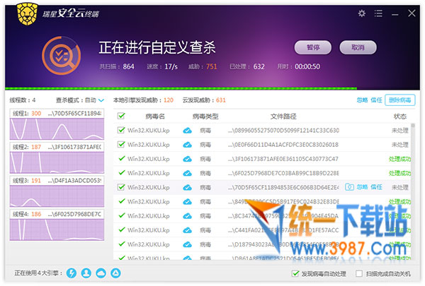 2) 病毒查杀、实时监控、木马查杀,多线程同时工作,扫描速度直线提升;