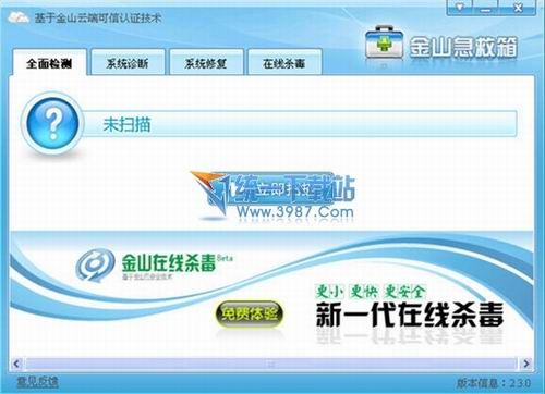 金山系统急救箱(一键诊断清除未知病毒)能够快速系统安全检测并强力清除已知顽固木马病毒,暴力删除未知木马如“超级av终结者”、扫荡波等病毒,并可以全面修复系统破坏项目。能够帮您修复因为病毒破坏而出现的系统异常。如不能复制粘贴,打印等系统问题。