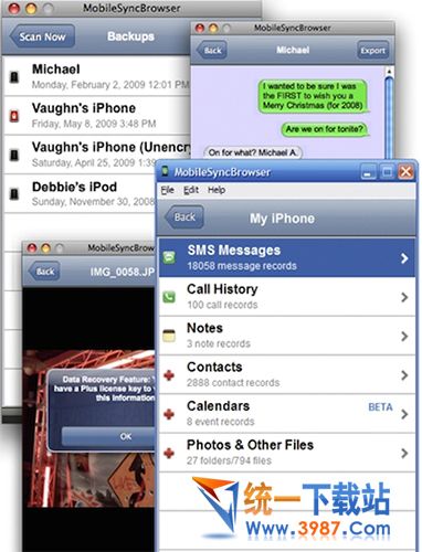 软件模仿iPhone界面,操作直观简便,启动后将会自动读取iTunes里所有iPod/iPhone的备份文件并以列表显示出来。对于一般用户来说,他们可以轻松查阅备份里的所有信息,了解电脑里最新的备份情况。对于一些不幸丢失手机的用户来说,它更能为你及时的找回那些重要的备份信息,特别是不再使用iPhone后,这些备份信息也能导出到其他手机当中。