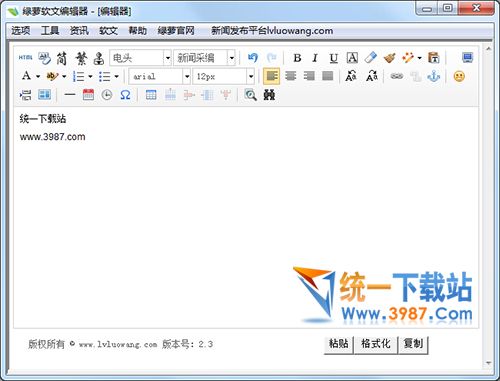 绿萝软文编辑器是一款软文编辑软件,拥有强大的文本编辑以及一键排版功能,帮助用户快速将文章格式化,使您的文章符合规范,软文投稿功能,可一键投稿到绿萝新闻发布平台,大大提高了用户的软件编辑效率。