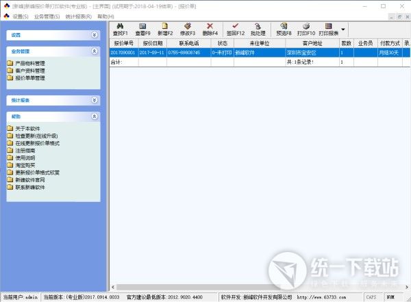 新峰报价单打印软件适用于小型企业或个人及个体户用于报价单管理。本软件集报价单、产品名称/产品单价/规格管理、分析、图表分析于一身.具用自动记忆功能。本软件操作简单,易上手。配有快捷菜单和快捷键,让你单手就可以完成报价单的录入工作。一次注册终生免费升级和技术支持.完全无后顾之忧。