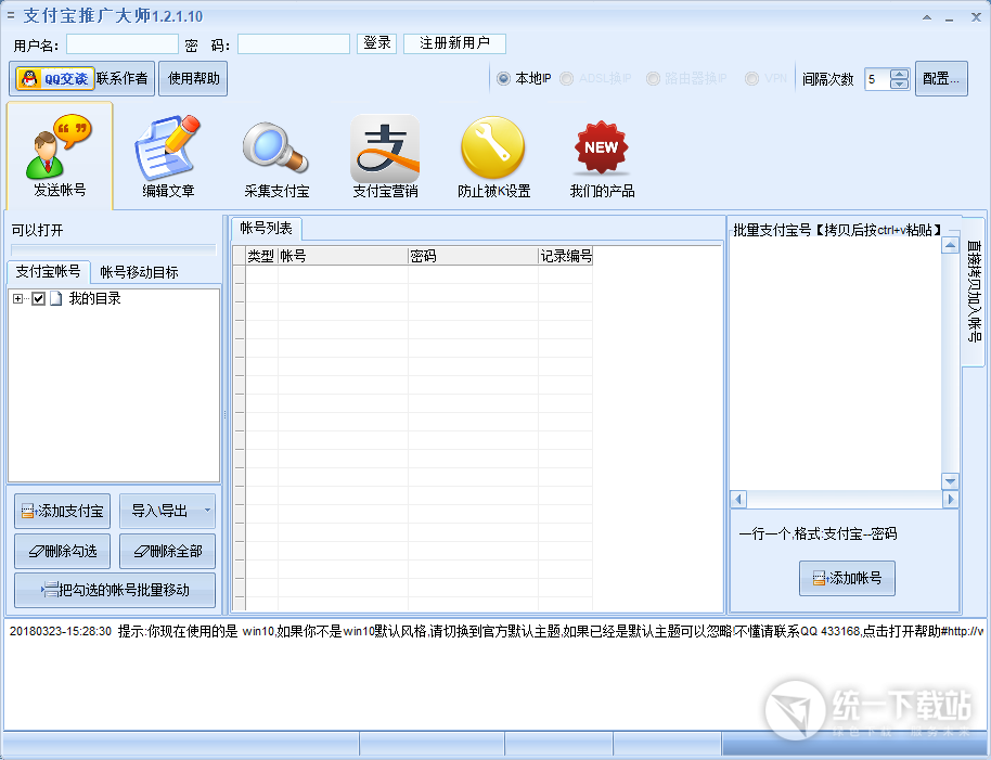支付宝推广大师是一款全自动的支付宝推广工具,包含支付宝帐号管理,手机号搜索,搜索加支付宝好友,手机通讯录加支付宝好友,支付宝好友发送消息,支付宝群营销。为了防止帐号被K,可以多帐号循环营销,可以使用ADSL模式,路由器换IP,操作简单。
