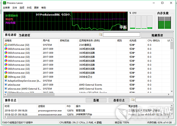 Process Lasso是一款独特的调试级别的系统优化工具。动态调整各个进程的优先级并设为合理的优先级类,实现为系统减负,此项特性被Process Lasso 定义为过载抑制(out-of-control restraint),可有效避免蓝屏、假死、进程停止响应、进程占用CPU 时间过多等症状。同时它还具备前台进程推进、工作集修整、进程黑名单等附加特性。