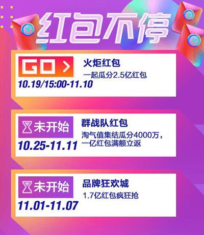 2017天猫双十一活动已经马不停蹄的开启啦,各种福利活动,现金红包从天而降,比如火炬红包就已经火热开抢,一起来瓜分2.5亿的红包,还有各种给力活动马上开启,下面跟随小编一起来看看今年双十一的活动时间表,千万别错过哦。