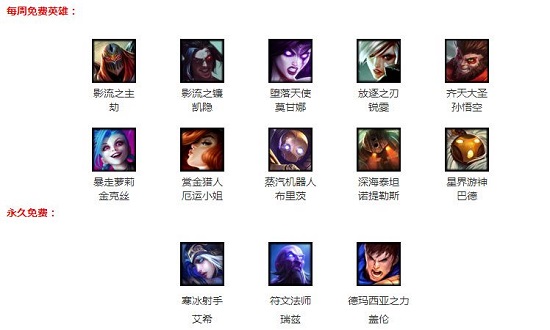 另外,在中国的服务器中,我们额外增加了三个永久免费的英雄——寒冰射手艾希、德玛西亚之力盖伦和符文法师瑞兹。这三个英雄是永久免费供所有玩家使用的。主要目的也是便于那些刚刚打完新手实战训练营的玩家能够至少有一个自己会用的英雄。