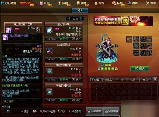 进入方法 商城——积分商城 界面大家可以看到,可以兑换的物品、消耗品,下面就由小编分析一下。