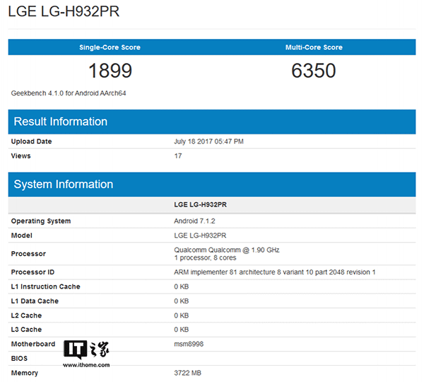 GeekBench的数据显示,LG V30型号为LG-H932PR,搭载了骁龙835处理器,配备4GB内存,预装了Android 7.1.2系统。根据之前的传闻,该机屏幕大小为6英寸,长宽比为18:9,支持无线充电功能和IP68级防尘防水。