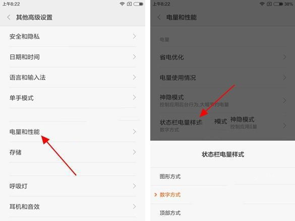 二、然后在其他高级设置设置中,我们再点击进入【电量和性能】设置,之后找到并点击【状态栏电量样式】,选择【数字方式】之后,我们就会发现此时红米Note4电池电量以百分比的形式显示了,如下截面图所示