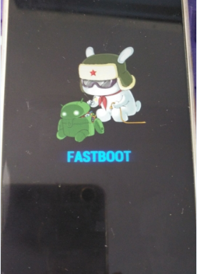 1:手机先进入FastBoot模式:进入方法为:手机在关机的状态下,按住手机的音量下键 + 电源键不要松,持续数秒即可进入,当屏幕中出现一只米兔正在修安卓机器人则已经进入FastBoot模式。