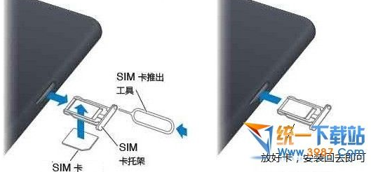 插SIM卡的时候,只要注意一下方向即可,一般都不会出错,如果出现SIM卡不能用,请检查下是否安装好,SIM卡方向是否放正确了。
