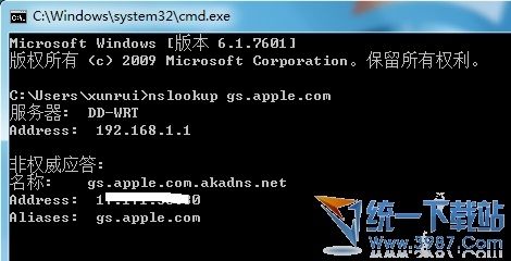 第一步:首先在运行中输入cmd,打开命令行窗口,输入命令“nslookup gs.apple.com”,则会找到了你地区访问gs.apple.com所得到的真实ip,记下你的IP。
