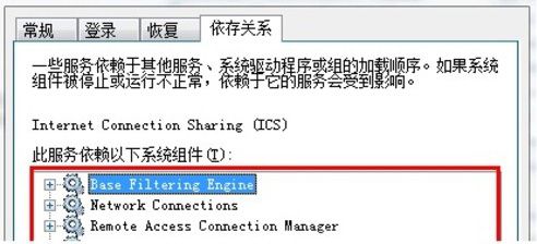 (3)如果提示无法启动说明与ICS有依存关系的某些服务没有启动,点开属性里“依存关系”标签,依次在服务管理列表里找到这4个服务,与之前一样设置成自动启动类型,并点击“启动”尝试开启服务,如果该服务也无法开启,则继续寻找该服务的“依存关系”服务,直到与ICS存在依存关系的4项服务全部开启,才能开启ICS服务。