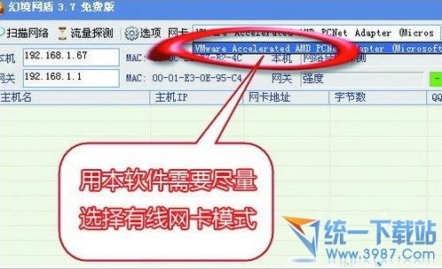 在主界面的“网卡”中,选择接入局域网所用的网卡。如果同时可以使用无线连接和有线连接,那么建议在“网卡”中选择有线网卡,而不要使用无线网卡,这点请大家记住了。因为视路由器不同,幻境网盾使用无线网卡可能根本无法控制别人的网速。