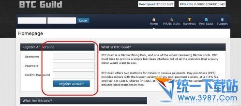 1、首先进入BTC guild主页在如图位置注册账号,注册过程十分简单只要填账号密码即可。(你可以去选择一些其他类似的比特币挖矿网站,都差不多)
