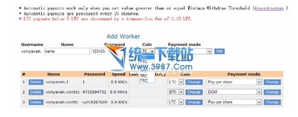 以coinotron为例。在注册完成后,自定义一个矿工号和密码,并选择LTC。