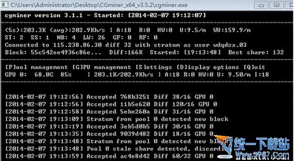 7一切配置好后,双击cgminer.exe就可以挖矿了。下图为正在挖矿。