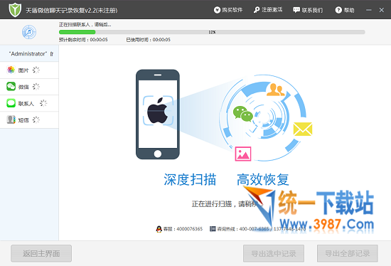 3、天盾微信聊天记录恢复软件会开始备份手机数据。数据成功备份后,即可开始扫描iPhone设备中的记录。