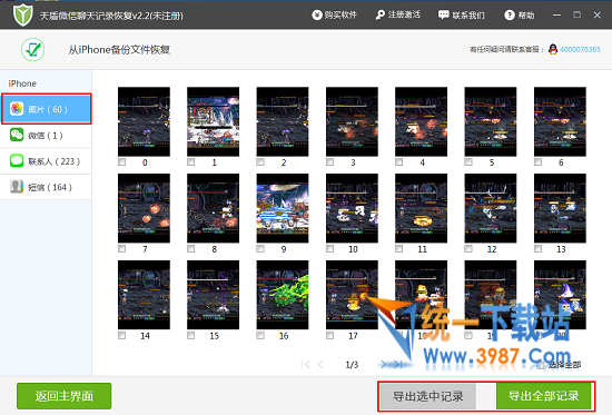 7、点击“短信”,可以点击“导出全部记录”将全部短信恢复,也可以勾选部分短信后,点击“导出选中记录”。