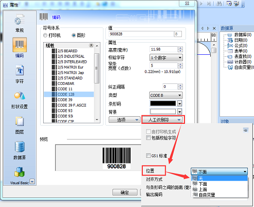 2、双击您创建的条码,打开“属性”对话框,在“编码”选项卡中,单击“人工识别符”,在其下方弹出的小窗口中,将“位置”通过下拉表设置为“无”。