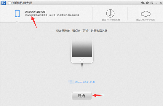 步骤二:开心手机恢复大师共有三种数据恢复模式:通过设备扫描恢复、通过iTunes备份恢复、通过iCloud备份恢复。考虑到许多用户都是在没有备份的情况下误删了数据。所以下文就以【通过设备扫描恢复】为例,教大家如何恢复误删的短信。将手机通过数据线连接进入电脑(第一次连接需在手机上点击【信任】),待显示设备已连接,进入开心手机恢复大师主界面。