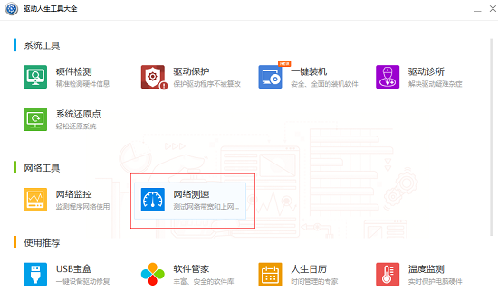 下载安装驱动人生,打开软件,在主界面的右下角你会看到“更多工具”这个选项,点击进入不用犹豫,接下来你会进入驱动人生工具大全子窗口,在网络工具中找到网络测速,点击即可开始测速。