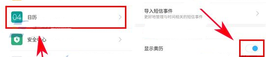 2、接着在系统应用里找到【日历】,点击它,最后把【显示黄历】选项右边的开关打开,这样系统日历就会显示黄历功能了。(如下图)