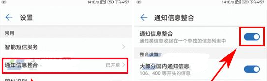 2、接着点击【通知信息整合】,然后开启开关就行了,这样就能自动整合了。