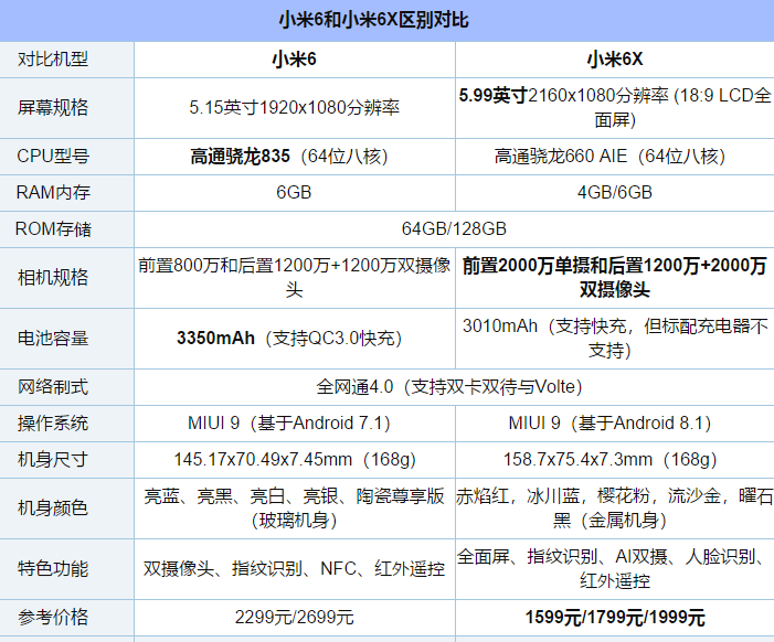 下面我们一起看看小米6X和小米6区别对比,各自在硬件配置、价格等方面都有哪些不同,具体对比如下图所示: