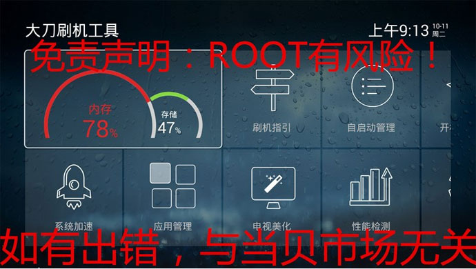 大刀刷机工具TV版是一款智能电视刷机前,刷机时,刷机后的一款刷机指导工具。 刷机前一键查找对应刷机包,刷机时如何操作,如何强刷,如何救砖,刷机后的如何进行系统优化,美化。 大刀刷机工具让智能电视刷机从此变得这么简单。