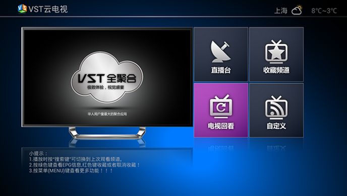 VST云电视TV版是一款全聚合直播软件,使用非常方便快捷,运行于智能电视盒或者智能电视;附带有300+个直播频道,24小时专人维护,带有7天国内卫视回看,电视在线收藏,P2P直播协议支持,操作简单 功能齐全,老人使用方便,无需任何设置 下载即可使用上手,比起其他软件 VST云电视更简单 更快速;继承用户数字电视习惯,上下按键换台,左右按键切换音量,还可以自己按菜单设置左右键切换流畅源,开机启动设置等