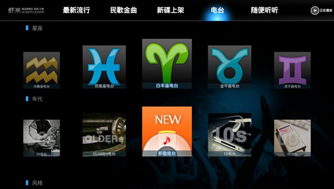 虾米音乐TV版是由中国最大在线音乐网站——虾米网根据上千万用户的音乐喜好、精准的音乐推荐算法引擎打造的个性化网络音乐服务,涵盖风格、年代、星座、心情等上百个音乐频道。
