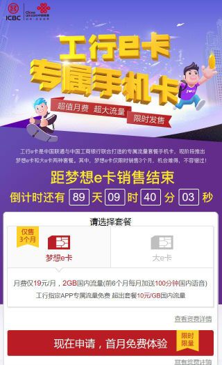 梦想E卡申请入口为您提供联通、工行联合推出的超值专属手机卡,超值的月费、超大的流量,梦想e卡仅售三个月,19元每月就可享受2GB的国内流量,并且前六个月还加送100分钟的国内语音,即刻拿起手机申请,首月可免费体验哦。