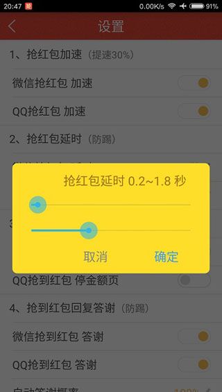 可以自由控制拆红包的延时时间。