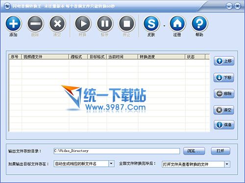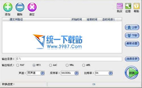 〖全能音频转换器〗支持目前所有流行的音、视频文件格式。如:MP3 MP2 OGG APE WAV WMA AVI RM RMVB ASF MPEG DAT 3GP MP4等,转换成MP3 WAV AAC WMA AMR音频文件。