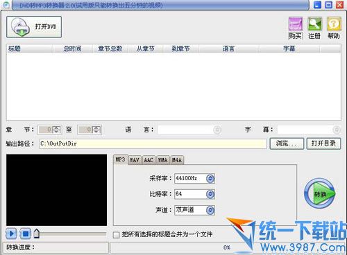 DVD转MP3转换器是一款功能强大的把DVD光盘输出音频的转换软件,它可以快速高质量地从DVD光盘中提取音频输出MP3,WMA,WAV,AAC,M4A等格式。它可以单独从DVD光盘中提取想要的精彩片段,也可以把多个片段合并输出一个文件。