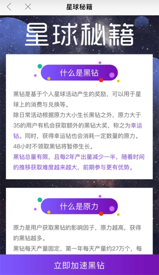 除日常活动根据原力大小生长黑钻之外,原力大于35的用户有机会获取额外的黑钻大奖,称之为幸运钻。同时,获得幸运钻也会消耗一定数量的原力。48小时不领取黑钻将暂停生长。