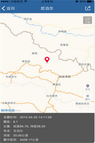 4、用户可通过地图查看震中的详细行政信息,以及震中附近的县城、医院和学校等的分布情况。