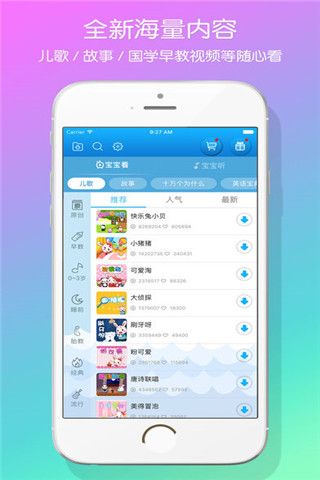 《早教儿歌》《摇篮曲》《少儿歌曲》《幼儿园儿歌》《节日儿歌》《英文儿歌》《校园歌曲》《童年歌曲》等系列,并与多名儿童小歌手签约,优先获取最新发布的儿歌。