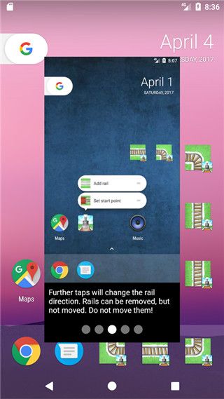 该应用程序从2个动态快捷方式(Rail和起点)开始。 每次添加新的轨道时,Rail动态快捷方式的ID都会更改,之前的ID将被删除,从而使固定的轨道快捷方式能够独立于动态轨道快捷方式,并允许您在屏幕上添加一条轨道 不同的方向。
