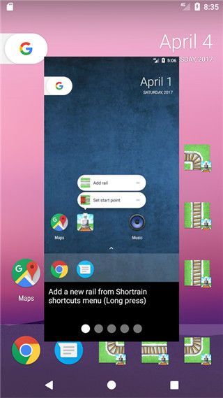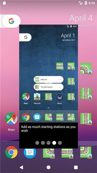 该应用程序从2个动态快捷方式(Rail和起点)开始。 每次添加新的轨道时,Rail动态快捷方式的ID都会更改,之前的ID将被删除,从而使固定的轨道快捷方式能够独立于动态轨道快捷方式,并允许您在屏幕上添加一条轨道 不同的方向。