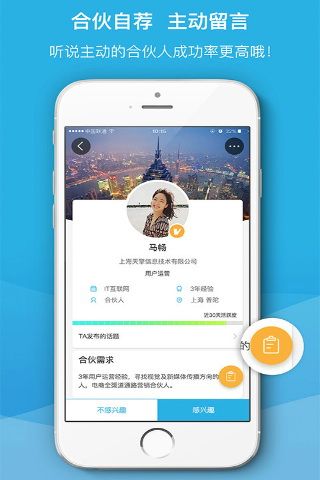 在爱合伙我们坚持创业先要找合伙人。“开放合作,寻求互补,利益共享”是我们的创业观。产品上的”合伙说“板块每天都会发布一个创业路上的真实问题,由会员来选择”赞成“或者”反对“并发表自己的观点。基于大家在一系列问题上的看法,系统会把在关键问题上看法一致的会员们更有效得匹配起来。