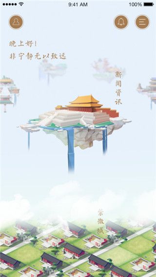 1.官方信息服务平台与用户内容创造平台的聚合空间,穿梭于宫、城双入口的平行世界,紫微宫中关于建筑、藏品、展览等十余类故宫文化随心获取,各类服务信息垂手可得;紫微城里基于传统建筑的体验式社区,双历法结合的用户成长体系,让你自由创造私属文化空间;