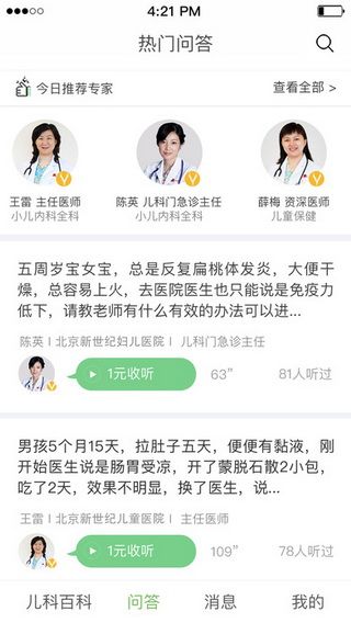 2.【问答】权威儿科专家一对一解答孩子健康问题,还可搜索与自己孩子类似的健康问题,直接收听专家解答。