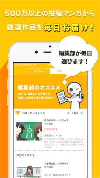 2300万人使用的世界最大的插图和漫画投稿网站“pixiv(ピクシブ)」公式漫画的应用程序。pixiv发的人气连载为首的,月400作品以上被更新官方作品和pixiv投稿的原创漫画免费阅读!