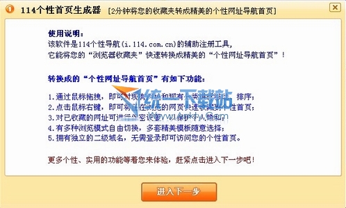 该软件是114个性导航的辅助注册工具,它能将您的“浏览器收藏夹”快速转换成精美的“个性网址导航首页”!转换成的“个性网址导航首页”有如下特点:1.通过鼠标拖拽,即可对现