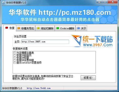 华华IE修复器是一款非常小巧实用的IE修复工具,可以快速修改IE主页,恢复起始页、标题按钮等等,还可以将收藏夹导出、删除地址栏、cookies等等,可以修复IE常见的一些问题,不管您的IE有没有问题,都可以来下载使用。