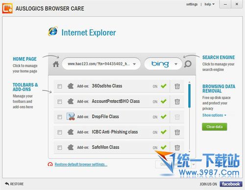 Auslogics Browser Care 主要用来选择性的清理各种浏览器插件、工具栏,还可以设置主页、清空缓存、修改默认搜索引擎。