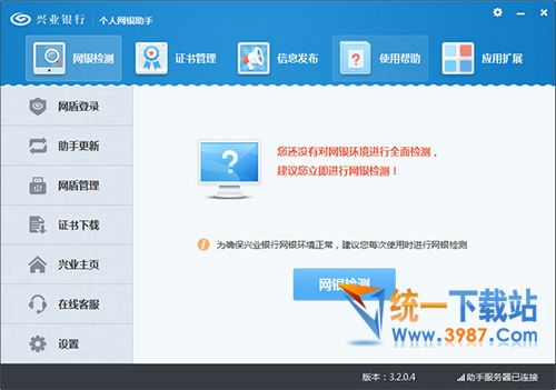 兴业银行网银助手是一款集安全防护、信息发布、应用扩展、自定义设置、快捷链接软件。网银检测可以对网银应用环境进行全面的检测,欢迎大家下载使用。