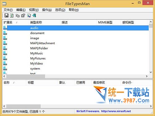 FileTypesMan是一个用来查看系统中已注册文件类型的小工具。当然,在“文件夹选项”里面的“文件类型”选项卡里面你也可以查看已注册的文件类型,但是显示的信息就没有FileTypesMan这么详细了。